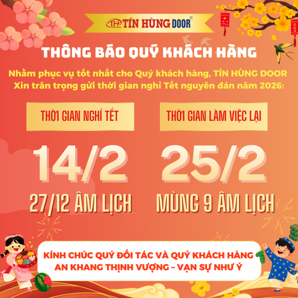 🔔 Nhằm phục vụ tốt nhất cho Quý Khách hàng trong dịp Tết Nguyên Đán sắp tới, TÍN HÙNG DOOR xin trân trọng thông báo lịch nghỉ Tết Nguyên Đán 2026 như sau.
